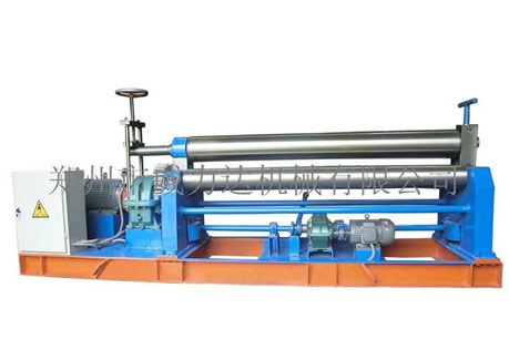 該機為對稱式三輥卷板機,兩下輥為主動固定輥,上輥通過升降絲桿、渦輪、蝸桿在兩下輥對稱中央作上下移動,兩下輥的左、右旋轉(zhuǎn)和上輥的升降移動均靠電機帶動減速器來完成,并能借助手動離合器把上輥調(diào)節(jié)成平行或傾斜位置,以適應(yīng)卷制圓形和錐形工件的需要,渦輪上下配有特種壓力軸承,轉(zhuǎn)動輕松、省電耐磨。該機集機身、傳動、電器部分為一整體,其結(jié)構(gòu)緊湊、操作方便、便于搬運、安裝和維護(hù)。